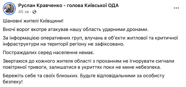 Руководитель Киевской ОГА Руслан Кравченко сообщил, что ночью оккупанты атаковали регион с помощью ударных дронов.