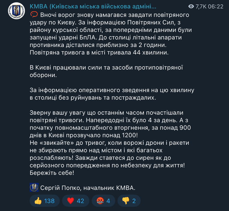 Начальник КМВА Сергей Попко рассказал, что ночью оккупанты пытались нанести удар по Киеву. По предварительным данным, враг запустил ударные БПЛА из Курской области.