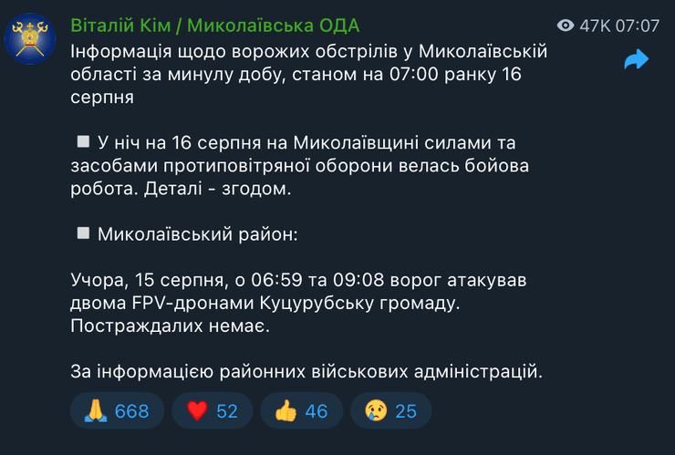 "В ночь на 16 августа на Николаевщине силами и средствами противовоздушной обороны велась боевая работа", — сказал Ким.