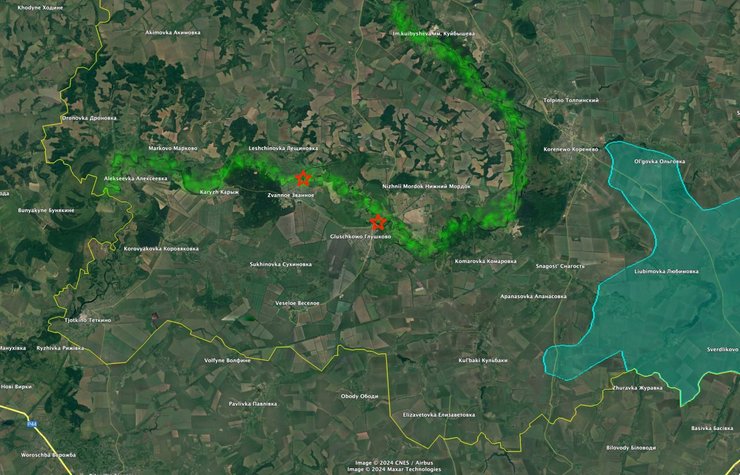 "До реки Сейм украинцам осталось 5 км. Чуть севернее идут бои за райцентр Коренево", — отметил эксперт BILD по анализу открытых данных Юлиан Рёпке.