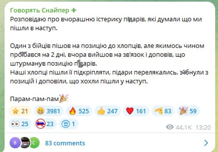 "Рассказываю о вчерашней истерике п**аров, которые думали что мы пошли в наступление. Один из бойцов пошел на позицию к ребятам, но каким-то образом пр**бался на 2 дня, вчера вышел на связь и доложил, что штурмовал позицию п**аров. Наши ребята пошли ее подкреплять, п**ары перепугались, с**нули с позиций и доложили, что х*хлы пошли в наступление. Парам-пам-пам", — написал Бунятов.