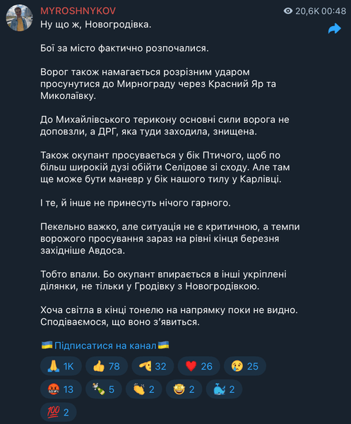 "Ну что ж, Новогродовка. Бои за город фактически начались", — сказал Богдан Мирошников.