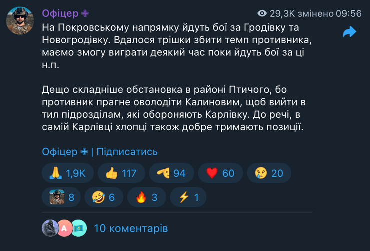 "На Покровском направлении идут бои за Гродовку и Новогродовку. Удалось немного сбить темп противника, можем выиграть некоторое время пока идут бои за эти н.п.", — сказал офицер ВСУ с позывным "Алекс".