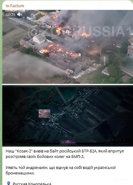 Украинский "Казак-2" вывел на "батл" российский БТР-82А, который в упор расстрелял своих боевых коллег на БМП-2. Между тем россияне в соцсетях распространили информацию, что уничтожили украинскую бронированную технику, что не соответствует действительности.