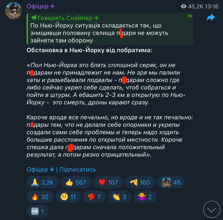Лейтенант ВСУ с позывным "Алекс" рассказал об обстановке в Нью-Йорке со ссылкой на своего побратима. По его словам, половина населенного пункта — это серая зона, которая не принадлежит ни украинским военным, ни россиянам.