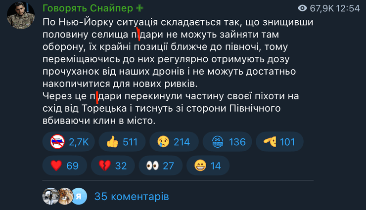 "По Нью-Йорку ситуация складывается так, что, уничтожив половину поселка, п*дары не могут занять там оборону. Их крайние позиции ближе к северу, поэтому, перемещаясь к ним, регулярно получают дозу порки от наших дронов и не могут достаточно накопиться для новых рывков", — сказал Станислав Бунятов.