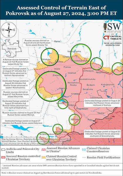 Дополнительные геолокационные кадры, опубликованные 27 августа, указывают на то, что российские войска незначительно продвинулись в юго-восточной части Гродовки (к востоку от Покровска и к северо-востоку от Новогродовки) и захватили Калиново. Российские военные корреспонденты также утверждали, что украинские силы "потеряли" Мариновку и Мемрик, хотя ISW не обнаружил визуальных свидетельств присутствия российских войск в этих населенных пунктах. Некоторые российские источники также утверждали, что российские войска продвинулись в южную часть Михайловки и наступают на северо-восточное Селидово.