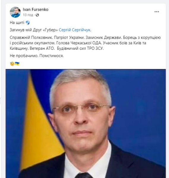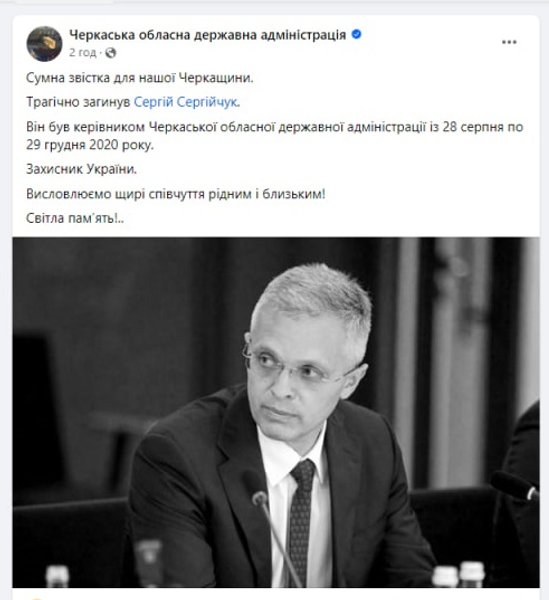 "Печальная весть для нашей Черкасской области. Трагически погиб Сергей Сергийчук. Он был руководителем Черкасской областной государственной администрации с 28 августа по 29 декабря 2020 года. Защитник Украины. Выражаем искренние соболезнования родным и близким", — говорится в сообщении.