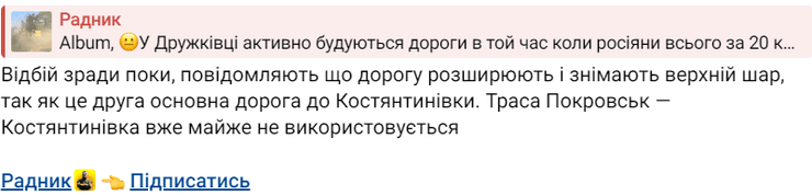 Эта дорога является основной к Константиновке. В соцсетях отметили, что дорогу расширяют, ведь трасса Покровск — Константиновка сейчас не используется.
