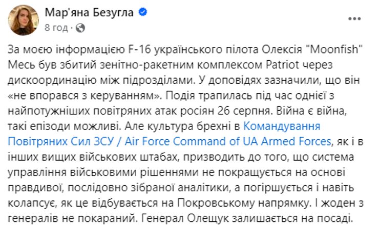 Безуглая отметила, что самолет F-16 украинского пилота Алексея Меся якобы был сбит зенитно-ракетным комплексом Patriot "из-за дискоординации между подразделениями".