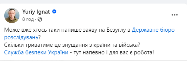 "Может уже кто-то таки напишет заявление на Безуглую в Государственное бюро расследований? Сколько продлится это издевательство над страной и войсками? Служба безопасности Украины — здесь наверняка и для вас есть работа!", — прокомментировал сообщение Юрий Игнат.