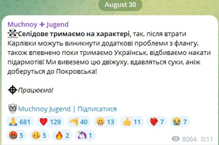 "Селидово держим на характере. Да, после потери Карловки могут возникнуть дополнительные проблемы с фланга, также уверенно пока держим Украинск, отбиваем накаты п**армотов! Мы вывезем эту движуху, подавятся суки, чем доберутся до Покровска", — написал он.