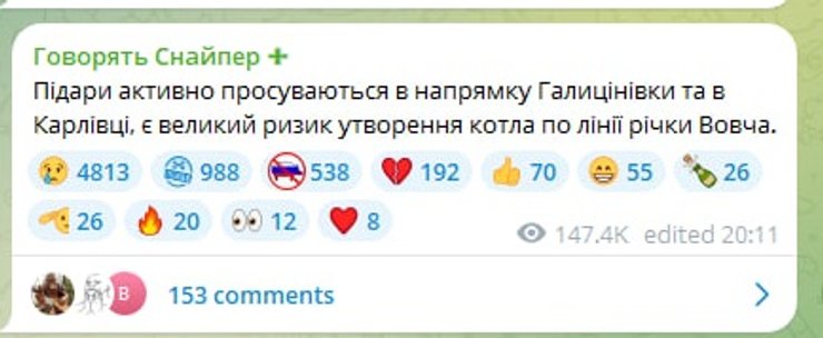 "П**ары активно продвигаются в направлении Галициновки и в Карловке, есть большой риск образования котла по линии реки Волчья", — говорится в сообщении.