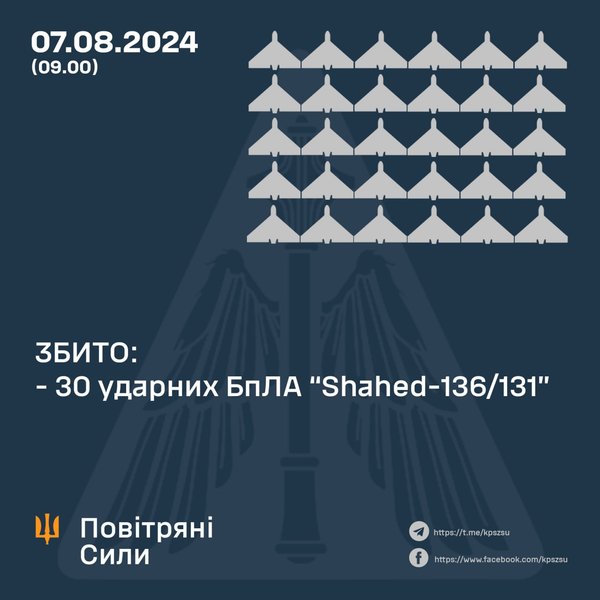 В ночь на 7 августа 2024 года российские оккупанты атаковали 30 ударными БпЛА типа "Shahed" из районов Приморско-Ахтарск и Ейск.