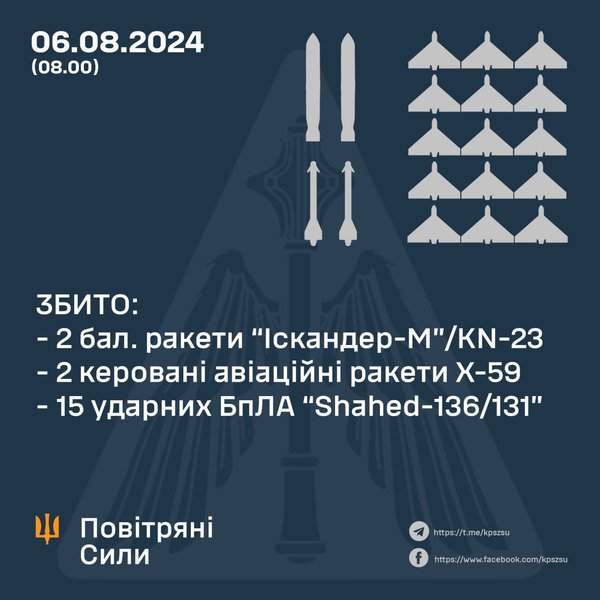 В ночь на 6 августа 2024 года противник выпустил 16 ударных БпЛА типа "Shahed" с направлений мыс Чауда в Крыму и Курска. Также россияне ударили 4-мя баллистическими ракетами "Искандер-М"/KN-23 и 2-мя управляемыми авиационными ракетами Х-59.