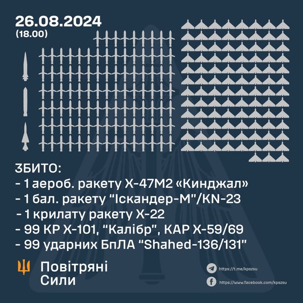 Ночь на понедельник 26 августа стала рекордной по количеству выпущенных средств поражения, которые, в основном, были нацелены на объекты критической инфраструктуры. Всего было обнаружено 236 средств воздушного нападения: 127 ракет и 109 ударных БпЛА. Среди них 3 аэробаллистические ракеты Х-47М2 "Кинжал", 6 баллистических ракет "Искандер-М"/KN-23, 77 крылатых ракет Х-101, 28 крылатых ракет "Калибр", 3 крылатые ракеты Х-22, 10 управляемых авиационных ракет Х-59/Х-69 и 109 ударных БпЛА "Shahed-131/136".