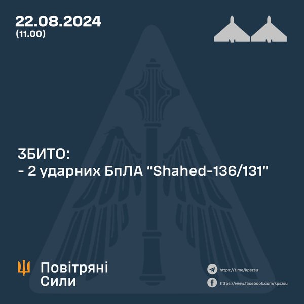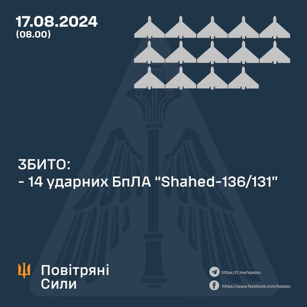 В ночь на 14 августа агрессоры атаковали украинцев 2-мя управляемыми авиационными ракетами Х-59/69 из воздушного пространства Белгородской области и 23-мя БПЛА "Shahed" из Крыма, Ейска и Курска.