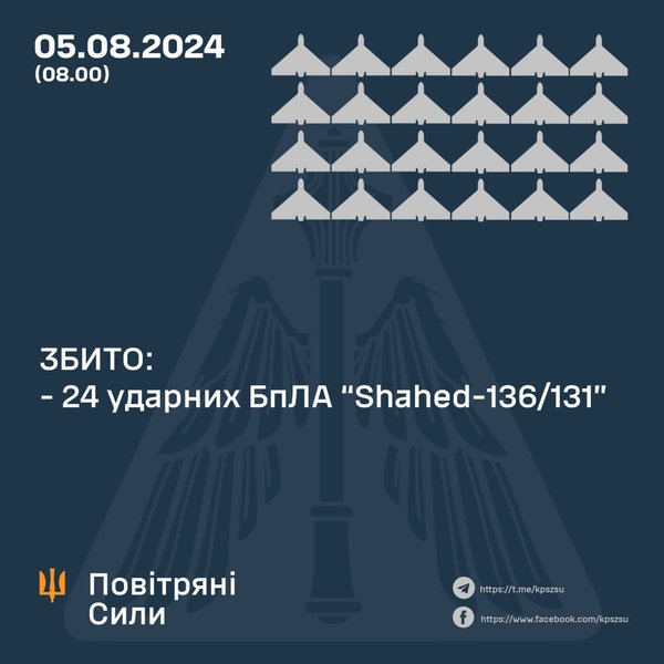 В ночь на 5 августа российские оккупанты атаковали 24 ударными БпЛА типа "Shahed" из районов Приморско-Ахтарск и Курск.