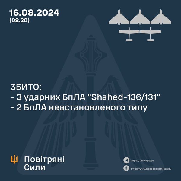 16 августа российские оккупанты наносили удары 3-мя баллистическими ракетами "Искандер-М", 3-мя БпЛА типа "Shahed", а также 2-мя беспилотниками неустановленного типа.