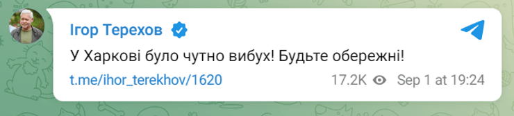 "В Харькове был слышен взрыв! Будьте осторожны!", — написал он в 19:24.