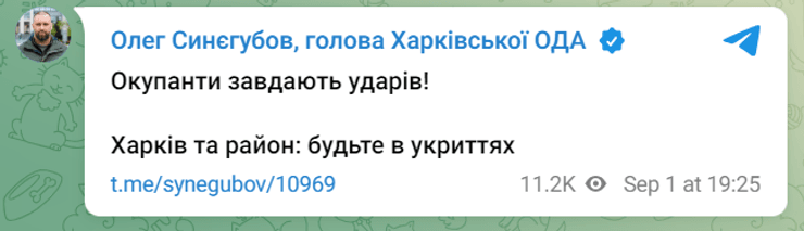 Находиться в укрытиях призвал председатель Харьковской областной военной администрации Олег Синегубов.