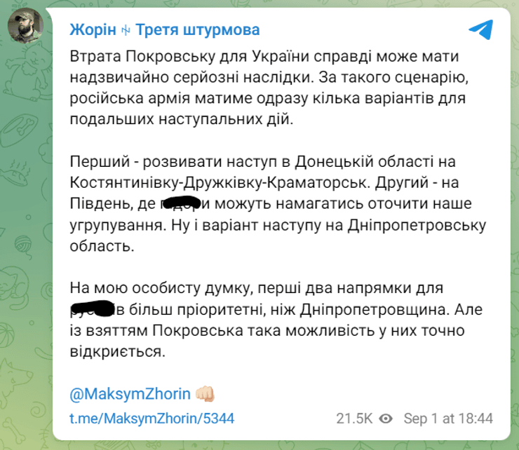 Заместитель командира Третьей отдельной штурмовой бригады Вооруженных сил Украины Максим Жорин заявил, что потеря Покровска может иметь "чрезвычайно серьезные последствия" для Украины. В случае захвата города российская армия получит несколько возможных направлений для дальнейшего наступления. Об этом майор ВСУ написал в Telegram в воскресенье, 1 сентября.