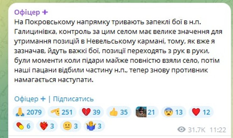 "На Покровском направлении продолжаются ожесточенные бои в населенном пункте Галициновка. Контроль за этим селом имеет большое значение для удержания позиций в Невельском "кармане". Позиции переходят из рук в руки, были моменты когда п**ары почти полностью взяли село, потом наши пацаны отбили часть населенного пункта, теперь снова противник пытается наступать", — проинформировал он.