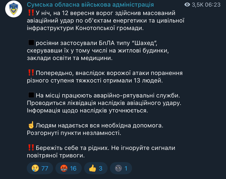 Ночью 12 сентября Вооруженные силы Российской Федерации нанесли массированный авиаудар по объектам энергетики и гражданской инфраструктуры Конотопской громады Сумской области. Об этом сообщили в Сумской ОГА в Telegram.