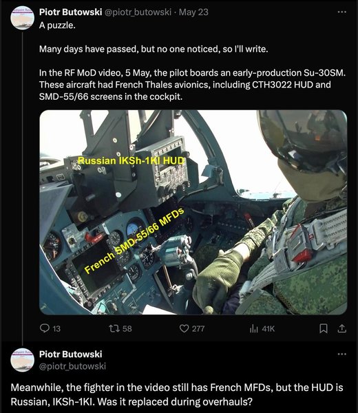 По состоянию на 2024 год у РФ имеется до 130 единиц модернизированных истребителей 4++ поколения Су-30СМ. Во время полномасштабной войны были потеряны не менее 15 таких бортов. По словам авторов публикации, потерь было бы больше. Это объясняется тем, что на самолетах Су-30СМ используется авионика иностранного производства, большей частью французских компаний Thales и Sagem/Safran.