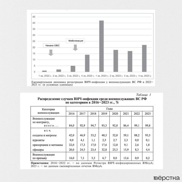 "Прослеживается выраженная связь роста регистрации ВИЧ-инфекции среди военнослужащих с началом "СВО" и проведением мероприятий по доукомплектованию войск (сил) личным составом", — пишут специалисты.