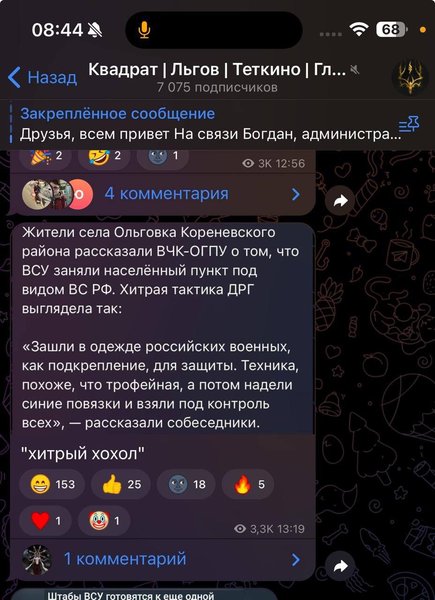 "Жители села Ольговка Кореневского района рассказали, что ВСУ заняли населенный пункт под видом ВС РФ. Хитрая тактика ДРГ выглядела следующим образом: "Зашли в одежде российских военных как подкрепление для защиты. Техника, похоже, трофейная, а потом надели синие повязки и взяли под контроль всех". Хитрый х*хол", — говорится в сообщении.