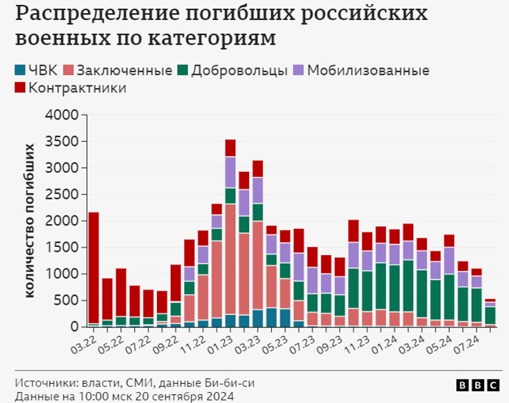 Журналисты установили, что на войне погиб минимум 13 781 доброволец — то есть 20% от общего числа подтвержденных потерь российской стороны. С сентября 2024 года потери добровольцев стали превышать потери других категорий участников войны, в том числе заключенных (19% всех установленных смертей) и мобилизованных (13%).