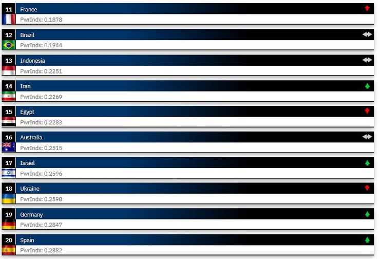 Те страны, которые возглавляют рейтинг, имеют большие финансовые расходы на армию, наличие ядерного оружия, большое количество личного состава и военной техники, мощный флот и богатые запасы природных ресурсов.