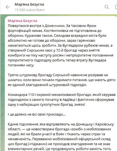 "За Часовым Яром фортификаций нет, Константиновка не подготовлена к обороне. Курахово также. Селидово внутри города было абсолютно не готово к обороне, сейчас лихорадочно пытаются что-то сделать. За Угледаром рубежей нет, а созданный Сырским хаос в 72-й бригаде из-за снятия комбрига на пике наступления россиян и неприоритетное пополнение приоритетного подразделения делает теперь потерю Угледара вопросом времени", — пишет Безуглая.