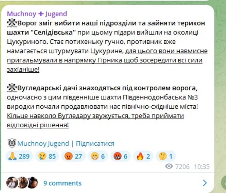 "Угледарские дачи находятся под контролем врага, одновременно с этим южнее шахты Южнодонбасская №3 уроды начали продавливать нас северо-восточнее города. Кольцо вокруг Угледара сужается, надо принимать соответствующие решения".