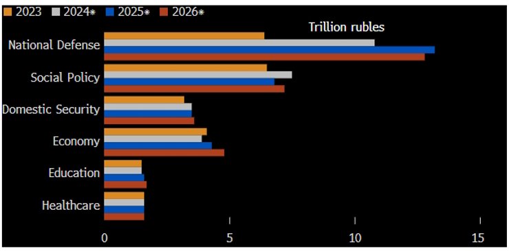 Расходы на национальную оборону и внутреннюю безопасность, как ожидается, составят около 40% от общего объема бюджетных расходов России в 2025 году. Это больше, чем совокупные ассигнования на образование, здравоохранение, социальную политику и национальную экономику. То есть, пишет Bloomberg, война Владимира Путина против Украины не подает никаких признаков окончания.