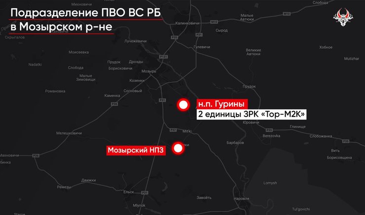Часть ЗРК "Тор-М2К" прибыла в Мозырский район. Там на окраине населенного пункта Гурины разместили по меньшей мере 2 боевые машины ЗРК "Тор-М2К". Расстояние от огневой позиции до Мозырского нефтеперерабатывающего завода составляет около 9 километров.