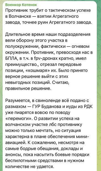Российские оккупанты были выбиты Силами обороны с агрегатного завода в Волчанске на Харьковщине. Зато в РФ заявили, что "отошли на выгодные позиции". Об этом в своем телеграм-канале написал российский военкор Юрий Котенок.