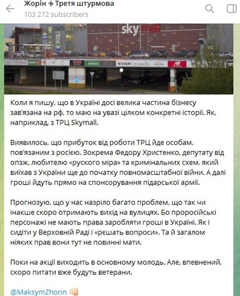 "Когда я пишу, что в Украине до сих пор большая часть бизнеса завязана на РФ, то имею в виду вполне конкретные истории. Как, например, с ТРЦ Skymall. Оказалось, что прибыль от работы ТРЦ идет лицам, связанным с Россией. В частности Федору Христенко, депутату от ОПЗЖ, любителю "русского мира" и криминальных схем, который выехал из Украины еще до начала полномасштабной войны. А дальше деньги идут прямо на спонсирование п**арской армии", — написал Жорин.