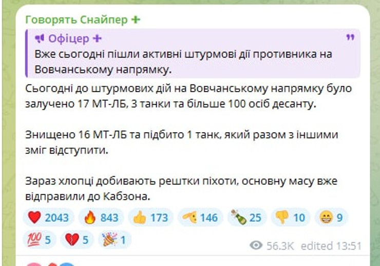 "Сегодня к штурмовым действиям на Волчанском направлении было привлечено 17 МТ-ЛБ, 3 танка и более 100 человек десанта. Уничтожено 16 МТ-ЛБ и подбит 1 танк, который вместе с другими смог отступить. Сейчас ребята добивают остатки пехоты, основную массу уже отправили в Кобзон", — проинформировал он.