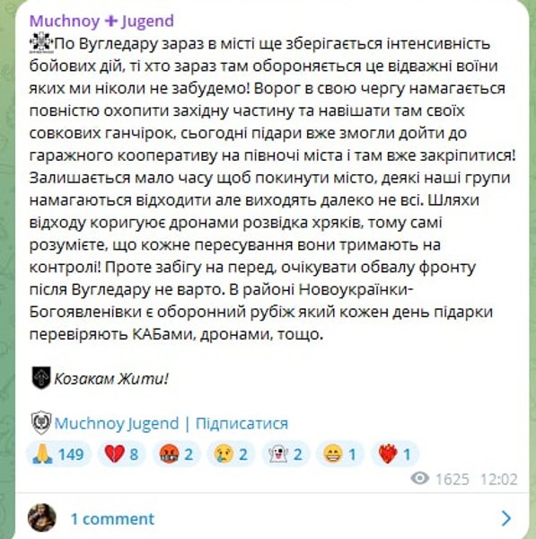 "По Угледару: сейчас в городе еще сохраняется интенсивность боевых действий, те кто сейчас там обороняется, отважные воины, которых мы никогда не забудем. Враг в свою очередь пытается полностью охватить западную часть и навешать там своих совковых тряпок. Сегодня п**ары уже смогли дойти до гаражного кооператива на севере города и там закрепиться", — проинформировал он.
