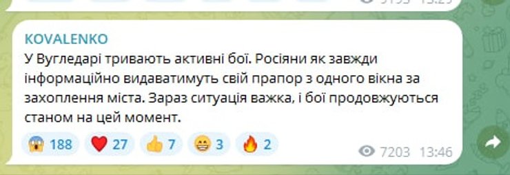"В Угледаре продолжаются активные бои. Россияне как всегда информационно будут выдавать свой флаг из одного окна за захват города. Сейчас ситуация тяжелая и бои продолжаются по состоянию на данный момент", — написал руководитель Центра, военный Андрей Коваленко.