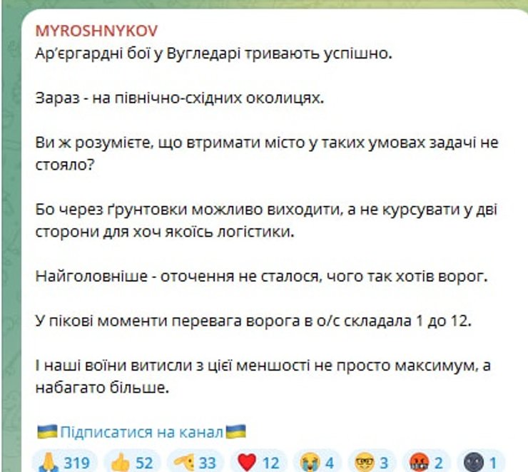 В Угледаре Донецкой области Силы обороны ведут успешные арьергардные бои на северо-восточных окраинах города. Об этом сообщил украинский военкор и блогер Богдан Мирошников.