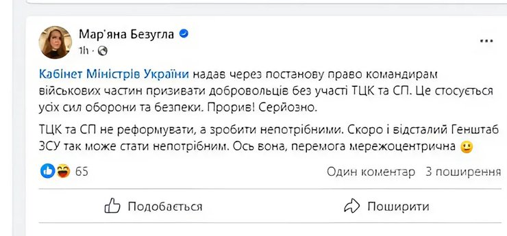 "Кабинет Министров Украины предоставил через постановление право командирам воинских частей призывать добровольцев без участия ТЦК и СП. Это касается всех сил обороны и безопасности. Прорыв! Серьезно. ТЦК и СП не реформировать, а сделать ненужными. Скоро и отсталый Генштаб ВСУ так может стать ненужным", — написала Безуглая.