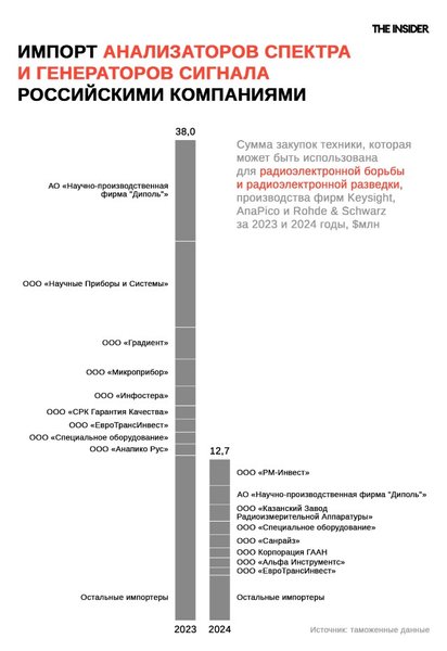 По словам журналистов, в 2023 году в Россию было завезено одних только генераторов и анализаторов спектра американского Keysight, немецкого Rohde & Schwarz и швейцарского AnaPico на сумму $38 млн, в 2024-м — на $12 млн. Средняя цена одного прибора — около $43 000.
