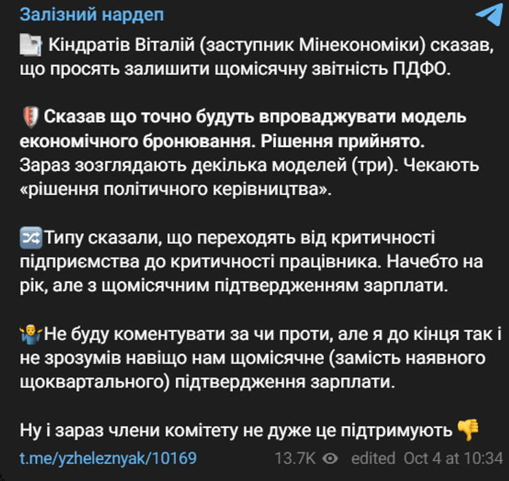 "Ждут "решения политического руководства". Сказали, что переходят от критичности предприятия к критичности работника. Вроде бы на год, но с ежемесячным подтверждением зарплаты", — уточнил он.