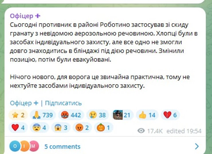 Российские оккупанты использовали против украинских защитников новый неизвестный газ. Несмотря на то, что бойцы воспользовались противогазами, они не смогли находиться в блиндаже. Об этом сообщил в своем телеграмм-канале "Офицер+" офицер ВСУ с позывным "Алекс".