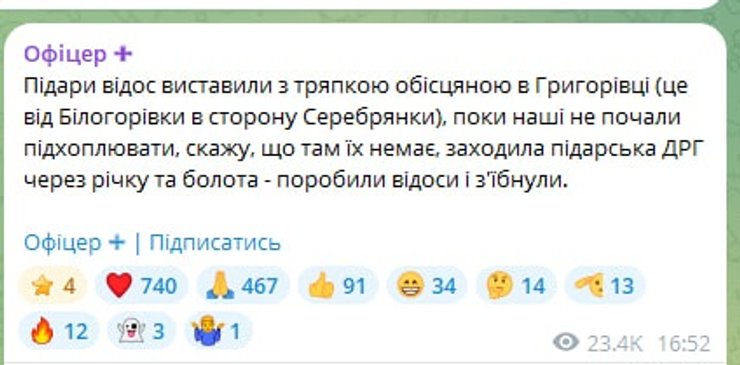"П**ары видос выставили с тряпкой обоссанной в Григорьевке (это от Белогоровки в сторону Серебрянки), пока наши не начали подхватывать, скажу, что там их нет, заходила п**арская ДРГ через реку и болота — сделали видосы и с**нули", — проинформировал он.