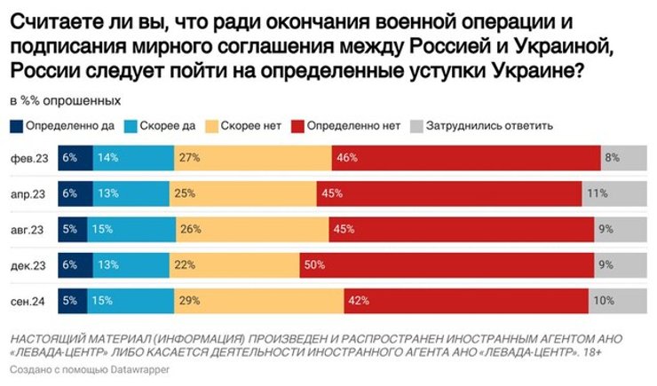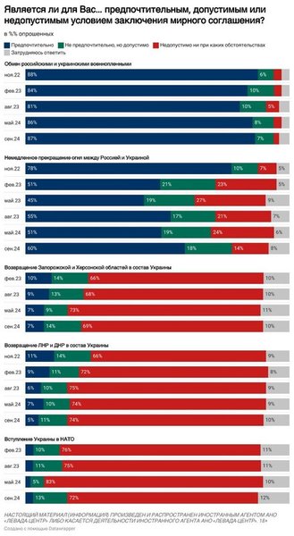 Таким образом, большинство россиян по-прежнему хотят быстрого окончания войны по текущей линии фронта, без возвращения захваченных территорий, 72% выступают против вступления Украины в НАТО как условия для прекращения конфликта.