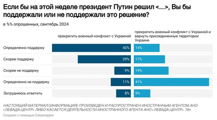72% опрошенных поддержали бы решение президента России Владимира Путина о прекращении войны против Украины уже на этой неделе (20% высказались против). Впрочем, только 31% согласились бы на мир в обмен на возвращение Украине ее территорий (60% не согласны).